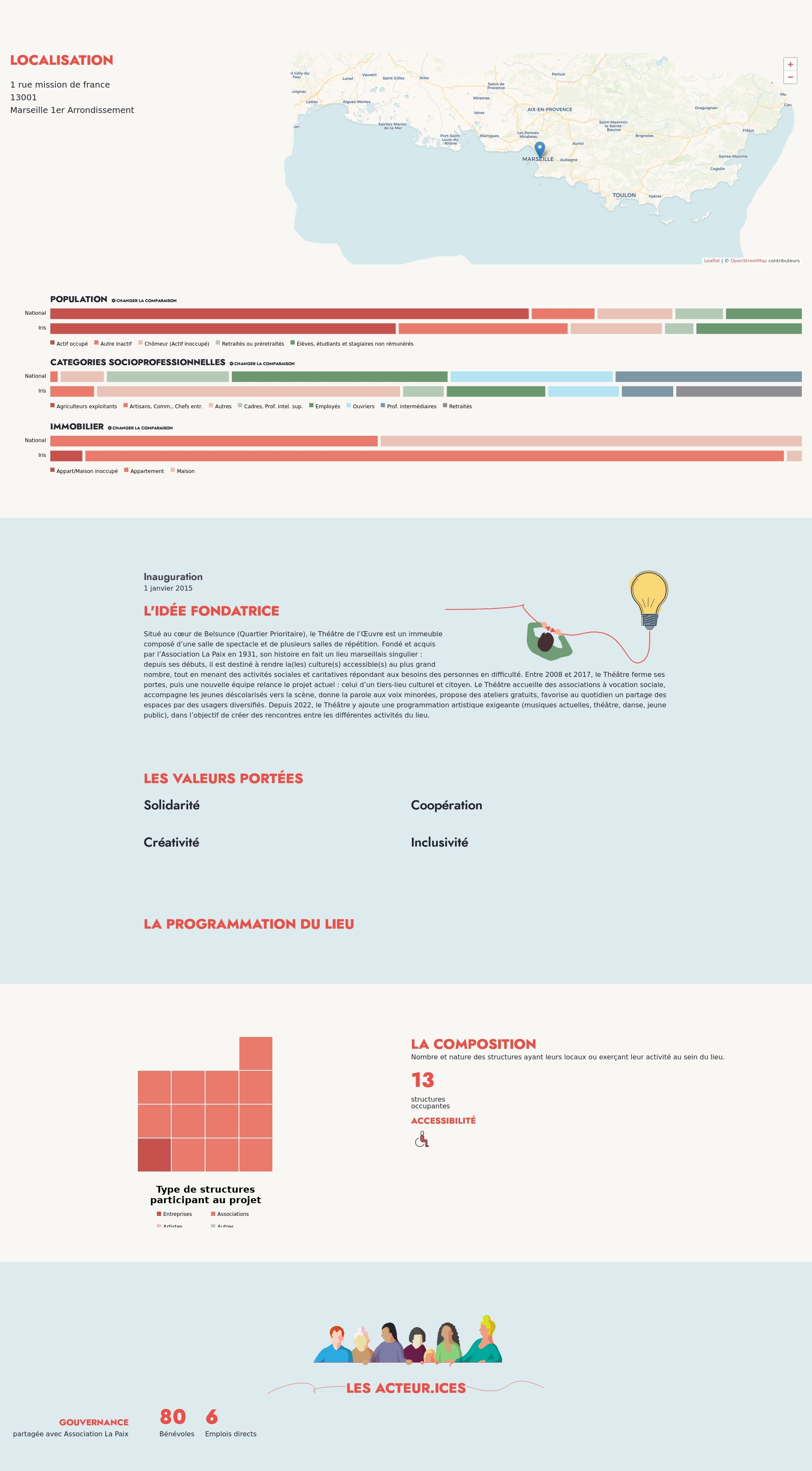Situé au cœur de Belsunce (Quartier Prioritaire), le Théâtre de l’Œuvre est un immeuble composé d’une salle de spectacle et de plusieurs salles de répétition. Fondé et acquis par l’Association La Paix en 1931, son histoire en fait un lieu marseillais singulier : depuis ses débuts, il est destiné à rendre la(les) culture(s) accessible(s) au plus grand nombre, tout en menant des activités sociales et caritatives répondant aux besoins des personnes en difficulté. Entre 2008 et 2017, le Théâtre ferme ses portes, puis une nouvelle équipe relance le projet actuel : celui d’un tiers-lieu culturel et citoyen. Le Théâtre accueille des associations à vocation sociale, accompagne les jeunes déscolarisés vers la scène, donne la parole aux voix minorées, propose des ateliers gratuits, favorise au quotidien un partage des espaces par des usagers diversifiés. Depuis 2022, le Théâtre y ajoute une programmation artistique exigeante (musiques actuelles, théâtre, danse, jeune public), dans l’objectif de créer des rencontres entre les différentes activités du lieu.