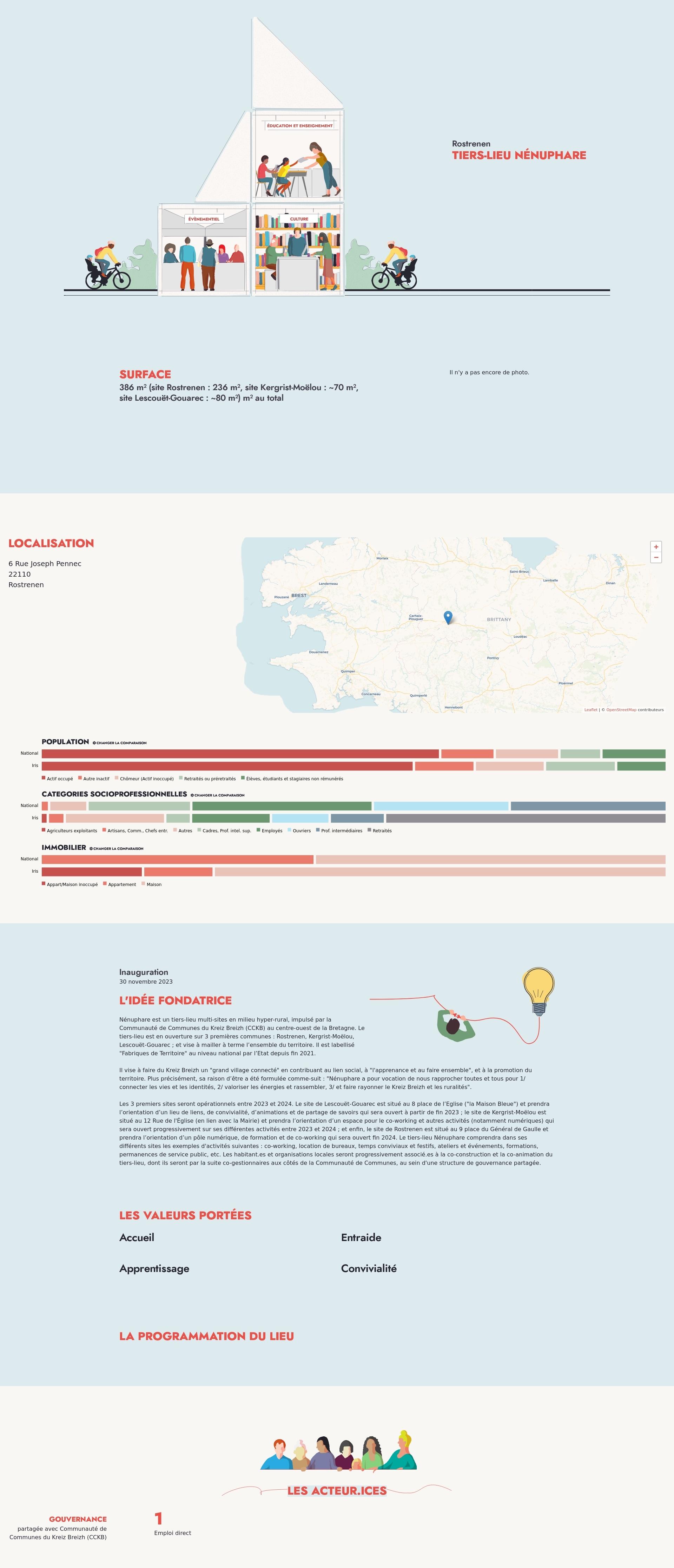 Les 3 premiers sites seront opérationnels entre 2023 et 2024. Le site de Lescouët-Gouarec est situé au 8 place de l’Eglise ("la Maison Bleue") et prendra l’orientation d’un lieu de liens, de convivialité, d’animations et de partage de savoirs qui sera ouvert à partir de fin 2023 ; le site de Kergrist-Moëlou est situé au 12 Rue de l'Église (en lien avec la Mairie) et prendra l’orientation d’un espace pour le co-working et autres activités (notamment numériques) qui sera ouvert progressivement sur ses différentes activités entre 2023 et 2024 ; et enfin, le site de Rostrenen est situé au 9 place du Général de Gaulle et prendra l’orientation d’un pôle numérique, de formation et de co-working qui sera ouvert fin 2024. Le tiers-lieu Nénuphare comprendra dans ses différents sites les exemples d'activités suivantes : co-working, location de bureaux, temps conviviaux et festifs, ateliers et événements, formations, permanences de service public, etc. Les habitant.es et organisations locales seront progressivement associé.es à la co-construction et la co-animation du tiers-lieu, dont ils seront par la suite co-gestionnaires aux côtés de la Communauté de Communes, au sein d'une structure de gouvernance partagée.