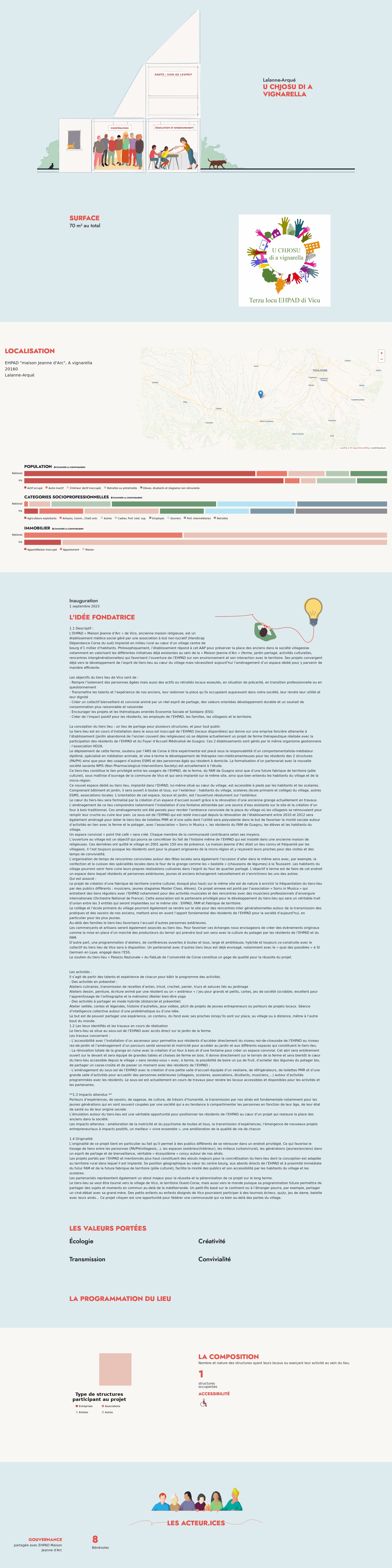 L’EHPAD « Maison Jeanne d’Arc » de Vico, ancienne maison religieuse, est un établissement médico-social géré par une association à but non-lucratif (Handicap Dépendance Corse du sud) implanté en milieu rural au cœur d’un village centre de bourg d’1 millier d’habitants. Philosophiquement, l’établissement répond à cet AAP pour préserver la place des anciens dans la société villageoise notamment en valorisant les différentes initiatives déjà existantes au sein de la « Maison Jeanne d’Arc » (ferme, jardin partagé, activités culturelles, rencontres intergénérationnelles) qui favorisent l’ouverture de l’EHPAD sur son environnement et son interaction avec le territoire. Ses projets convergent déjà vers le développement de l’esprit de tiers-lieu au cœur du village mais nécessitent aujourd’hui l’aménagement d’un espace dédié pour y parvenir de manière efficiente.