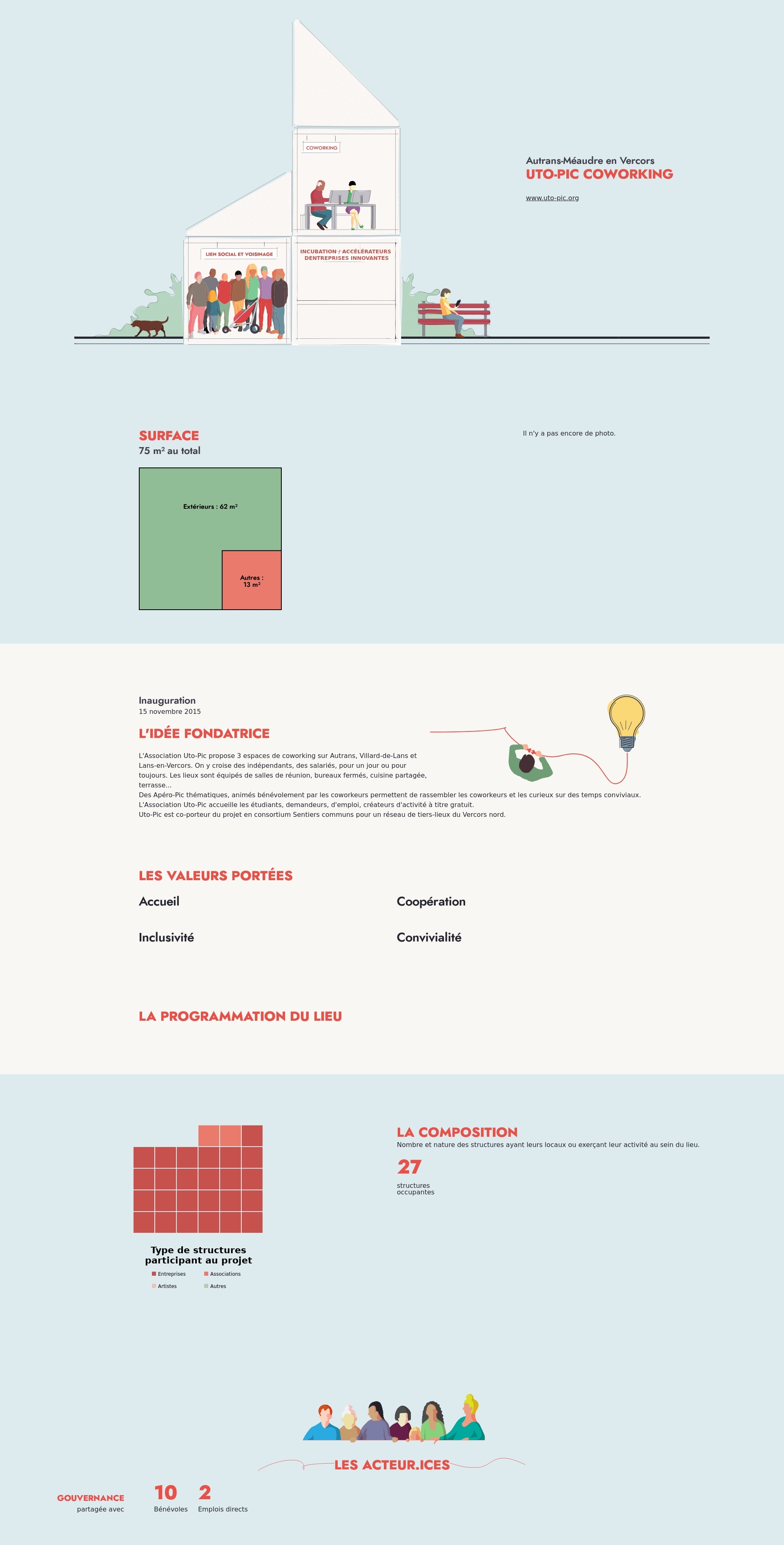 L'Association Uto-Pic propose 3 espaces de coworking sur Autrans, Villard-de-Lans et Lans-en-Vercors. On y croise des indépendants, des salariés, pour un jour ou pour toujours. Les lieux sont équipés de salles de réunion, bureaux fermés, cuisine partagée, terrasse...