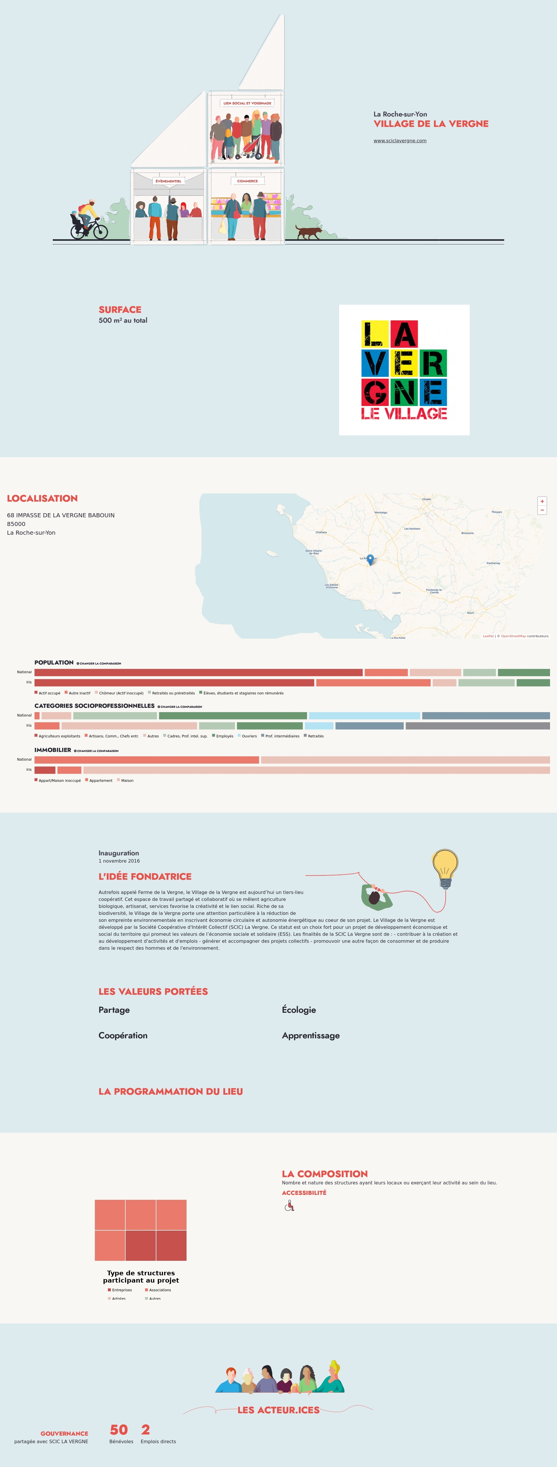 Autrefois appelé Ferme de la Vergne, le Village de la Vergne est aujourd’hui un tiers-lieu coopératif. Cet espace de travail partagé et collaboratif où se mêlent agriculture biologique, artisanat, services favorise la créativité et le lien social. Riche de sa biodiversité, le Village de la Vergne porte une attention particulière à la réduction de son empreinte environnementale en inscrivant économie circulaire et autonomie énergétique au coeur de son projet. Le Village de la Vergne est développé par la Société Coopérative d'Intérêt Collectif (SCIC) La Vergne. Ce statut est un choix fort pour un projet de développement économique et social du territoire qui promeut les valeurs de l’économie sociale et solidaire (ESS). Les finalités de la SCIC La Vergne sont de : - contribuer à la création et au développement d'activités et d'emplois - générer et accompagner des projets collectifs - promouvoir une autre façon de consommer et de produire dans le respect des hommes et de l'environnement.