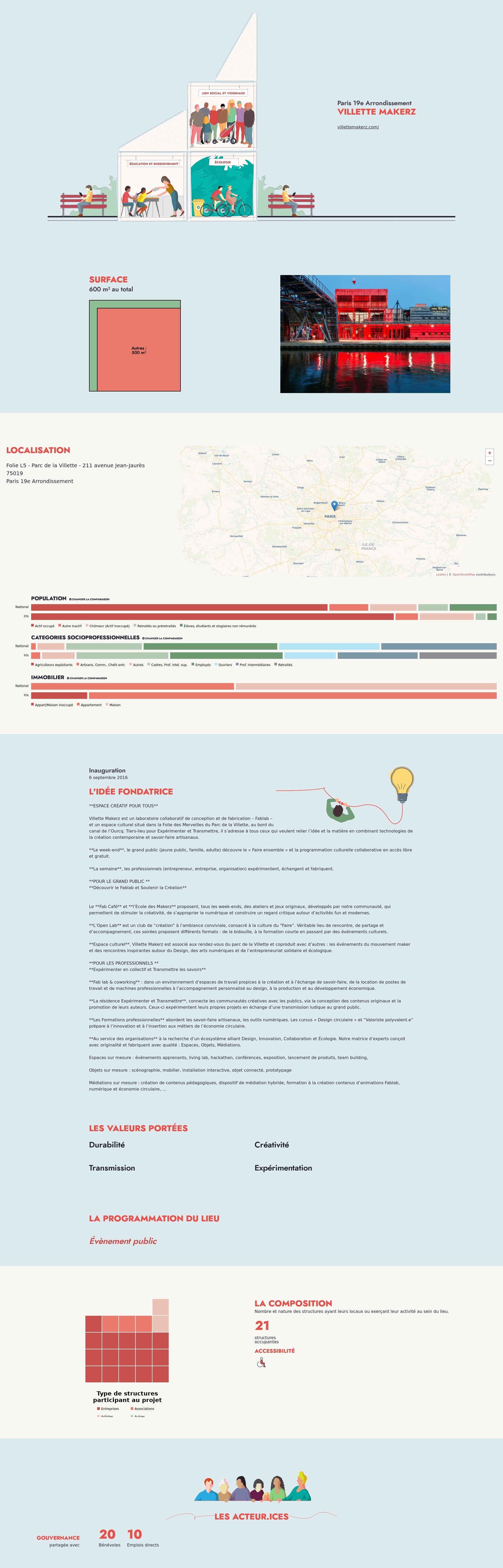 **Espace culturel**, Villette Makerz est associé aux rendez-vous du parc de la Villette et coproduit avec d’autres : les événements du mouvement maker et des rencontres inspirantes autour du Design, des arts numériques et de l’entrepreneuriat solidaire et écologique.