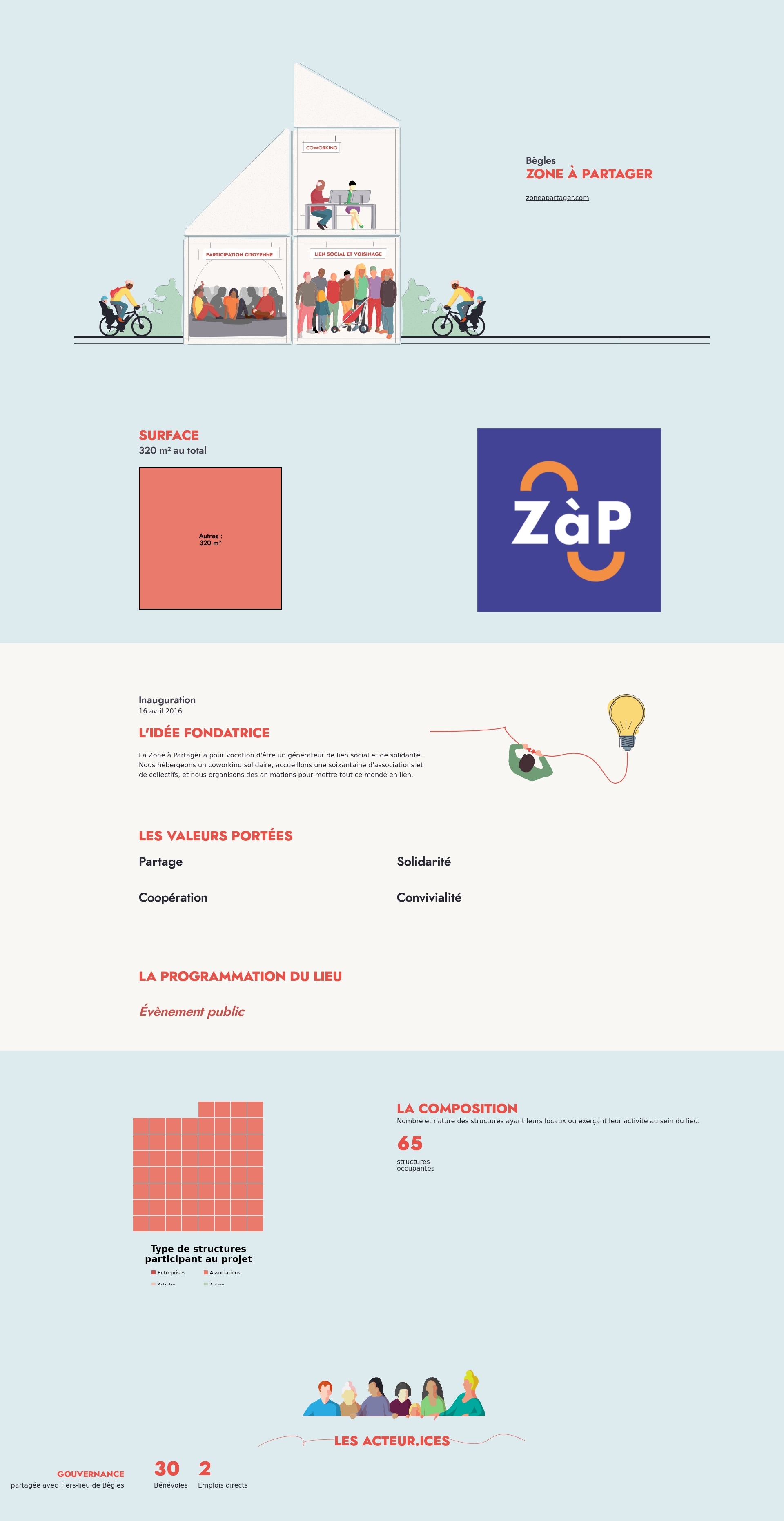 La Zone à Partager a pour vocation d'être un générateur de lien social et de solidarité. Nous hébergeons un coworking solidaire, accueillons une soixantaine d'associations et de collectifs, et nous organisons des animations pour mettre tout ce monde en lien.